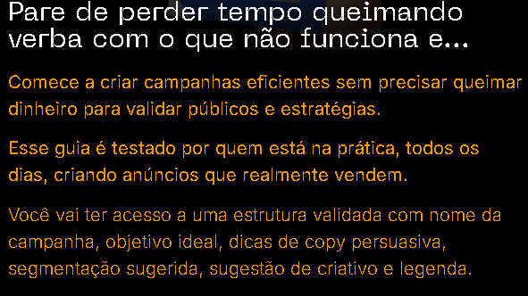 Acabe com o achismo e aplique estruturas de campanhas de alta conversão testadas e usadas todos os dias por quem vive do tráfego e já gerou mais de R$400 milhões em vendas.